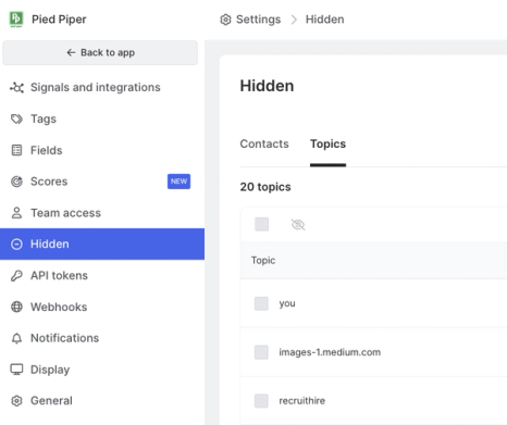 This settings page lets you view and manage all Contacts and topics that are hidden from search results and activity.