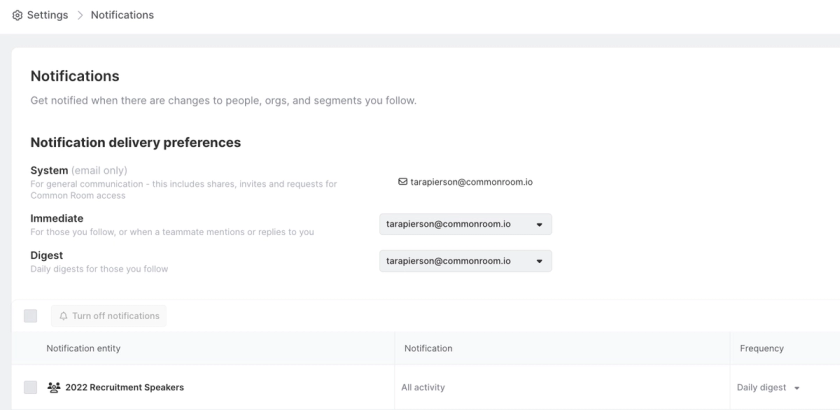 From the notifications settings page, you can manage all active notifications generated from your members, organizations, and segments. Select one or more active notifications to turn off the notification, or change the frequency to either immediate or daily digest.