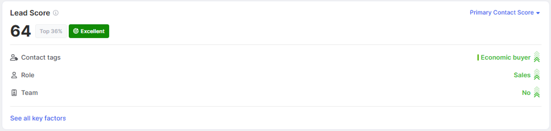 - Once a score has been set up in the system, you must define at least one score for Contacts and Organizations each as the Primary score using the radio buttons on the left. Primary scores will automatically be shown on Contact and Organization Profile views like a key field. The display also features what key factors went into that score, so it's easy for users of Common Room to see what makes a profile valuable or not at a glance.