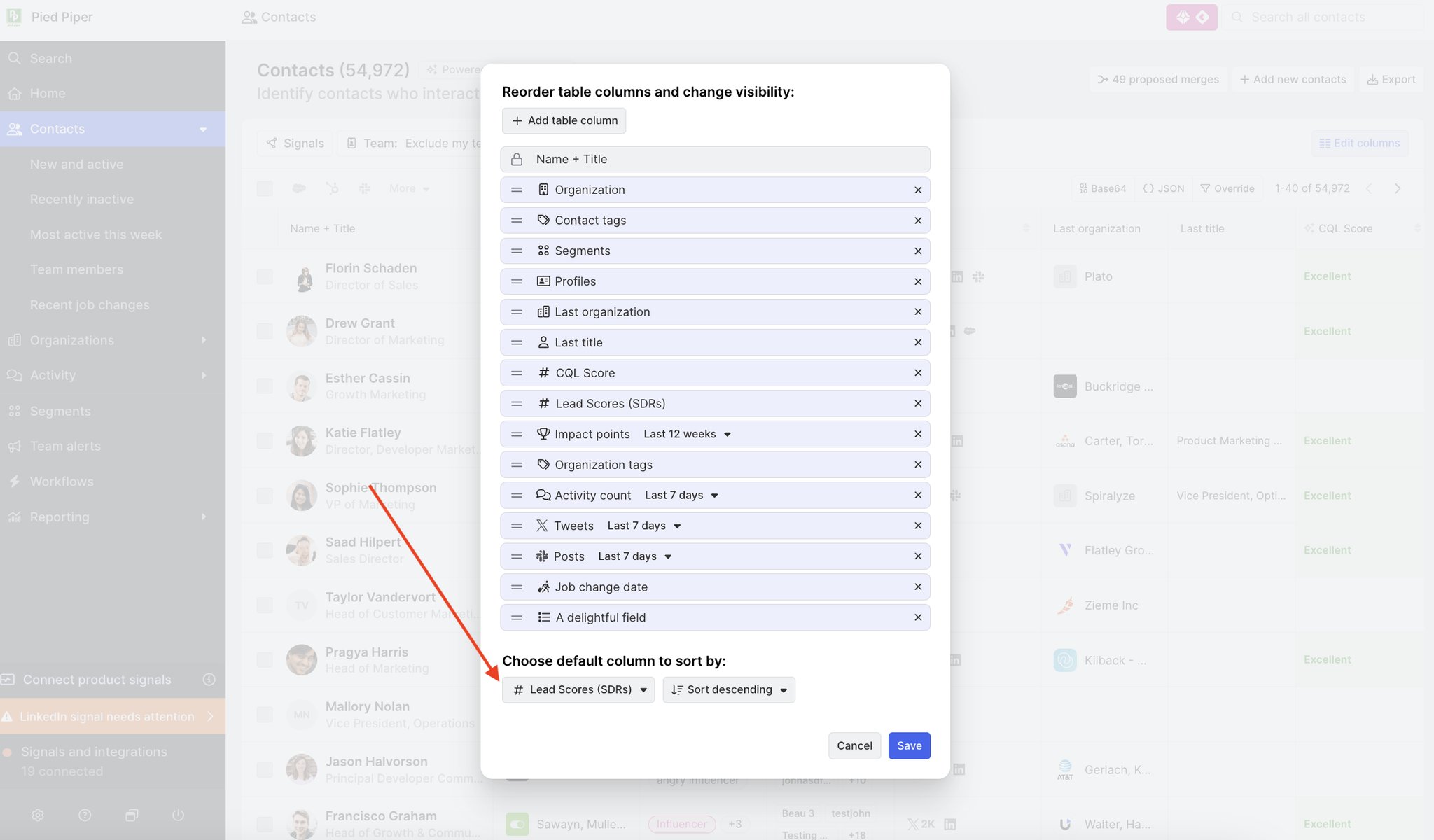 Once scores are created, both primary and non-primary scores will be managed like custom fields in Common Room. Scores can be easily added to table views using the Edit columns button at the top right.