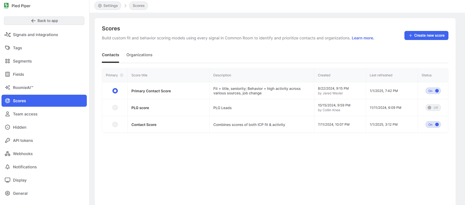 Scoring model creation begins in the settings tab of Common Room. Models can be created for both Contacts and Orgs. Each room is allowed to create multiple models but only five models can be enabled at the same time. Once scoring models are enabled they will show as custom fields on Contacts and Orgs and can used and managed in the same manner that other custom fields are in Common Room.