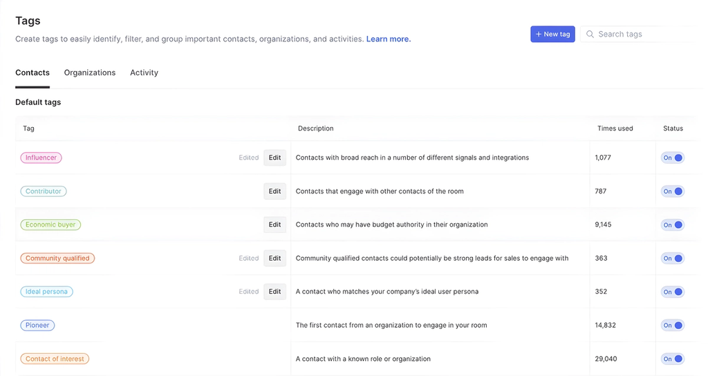 The tags setting page allows you to manage your Contact, Organization, and Activity tags. You can also see basic stats on tags such as how many times they have been used or when they were created. Common Room provides a set of default tags, but you can also create your own custom tags here on the settings page.