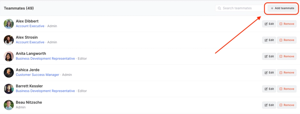 - To add a teammate to Common Room, click + Add teammate.