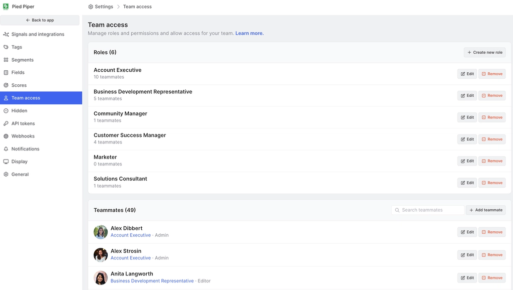 Common Room provides several default roles, but you can create new roles for any position in your organization. To create a new role, open Settings → Team access, then click Create a new role. Afterward, you can add segment templates and teammates to the role.