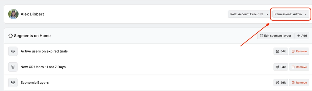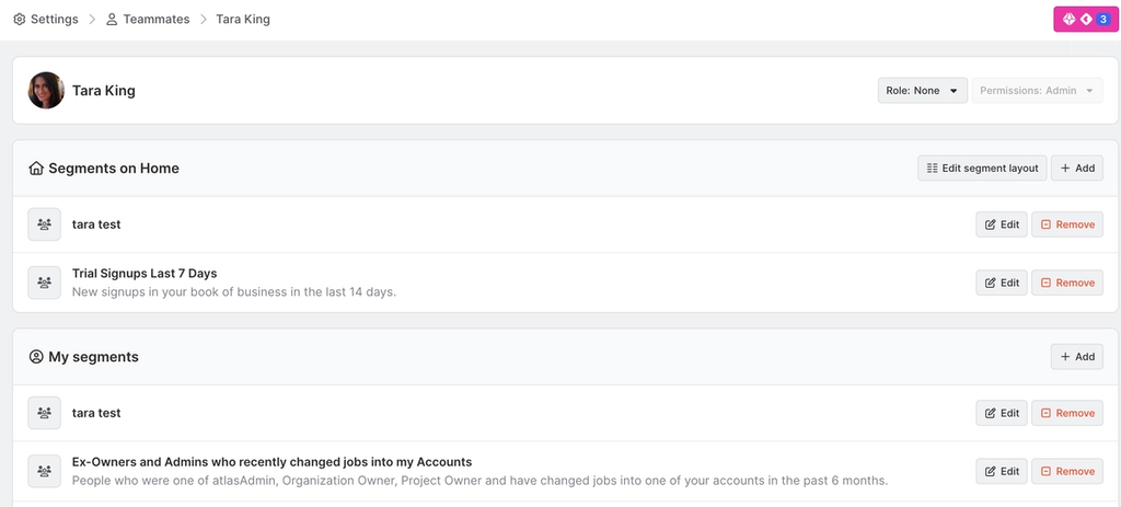 When editing a teammates profile, you'll see a list of segments. Segments on home is a list of segments that a teammate has added to their Common Room home page. My segments is a list of segments that a teammate has created.