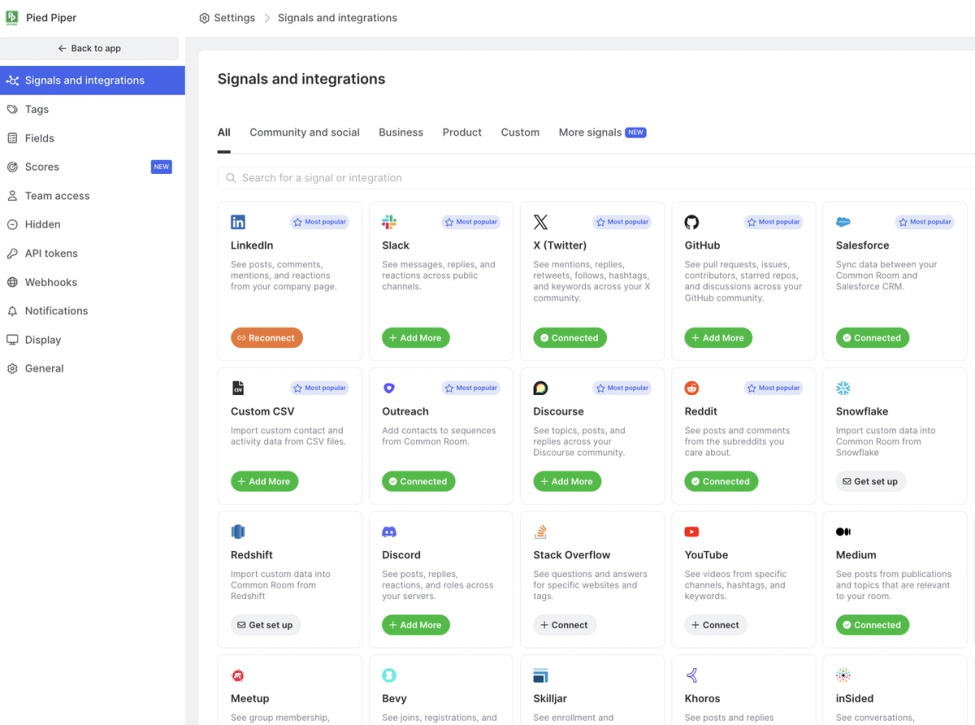 By default, Common Room has numerous out-of-the-box signals and integrations that can be added to your room. Additionally, to ensure you can bring in bespoke signals Common Room makes it easy to connect to other signal providers to have their information added to Contacts and Organizations.