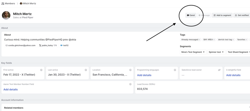 Once you’ve finished setting up your field mappings and are ready to test, find a Contact you know exists in your Salesforce instance and open their Contact profile. Press the Send to Salesforce button to sync the mapped fields for this Contact to Salesforce, then view that Contact in Salesforce to confirm that all fields are updated as expected.