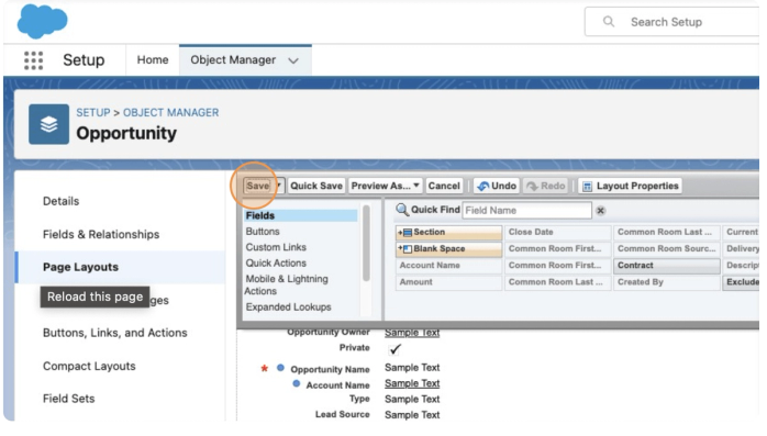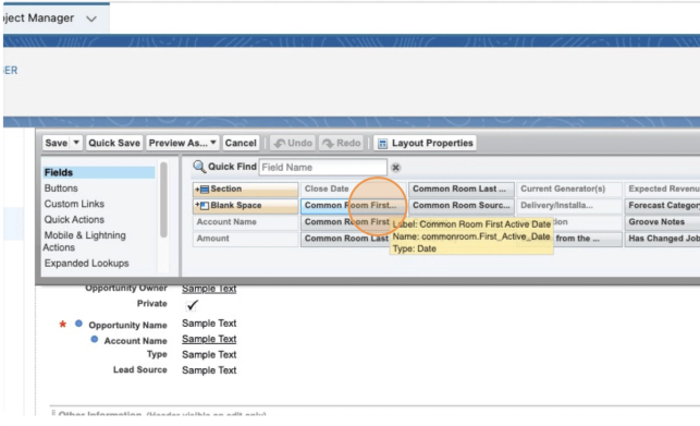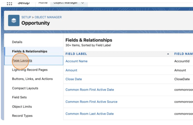 - Next, we will review how to add fields in the Common Room application to the page layout of your Salesforce objects (Lead, Contact, Account, and Opportunity). We will use Opportunity as our example.