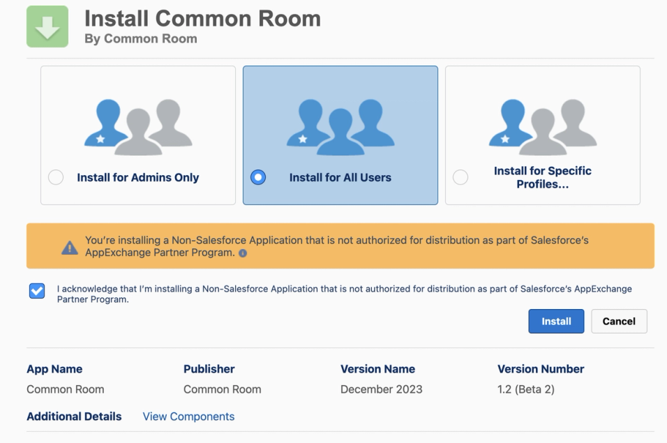 - Click "Install for All Users," or select the specific profiles you'd like to have access to the Common Room app. You can also click "View Components' to review what components will be installed in the package. The package includes Fields, Reports, and Flows which interact with the Account, Lead, Contact, Opportunity, and Opportunity Contact Role objects in Salesforce: