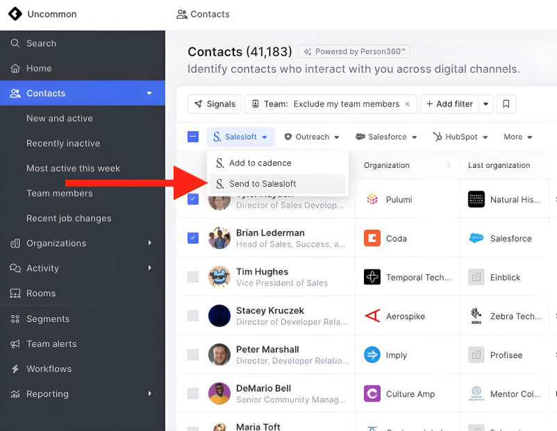 You can add one or more Common Room Contacts to a Salesloft Cadence directly from Contacts and Segments.