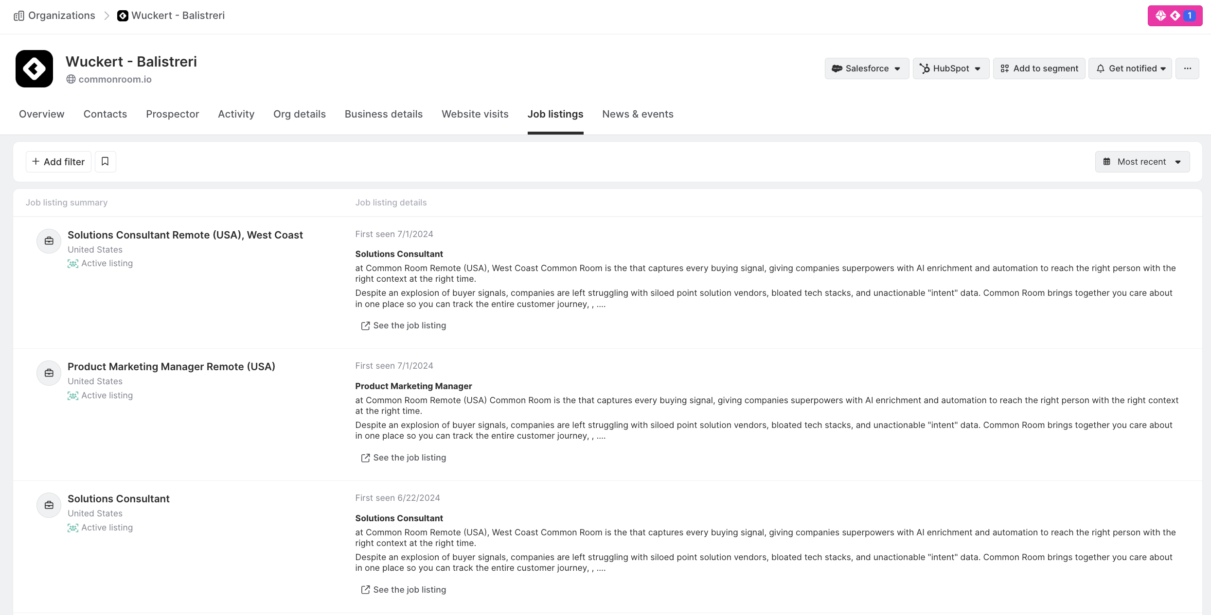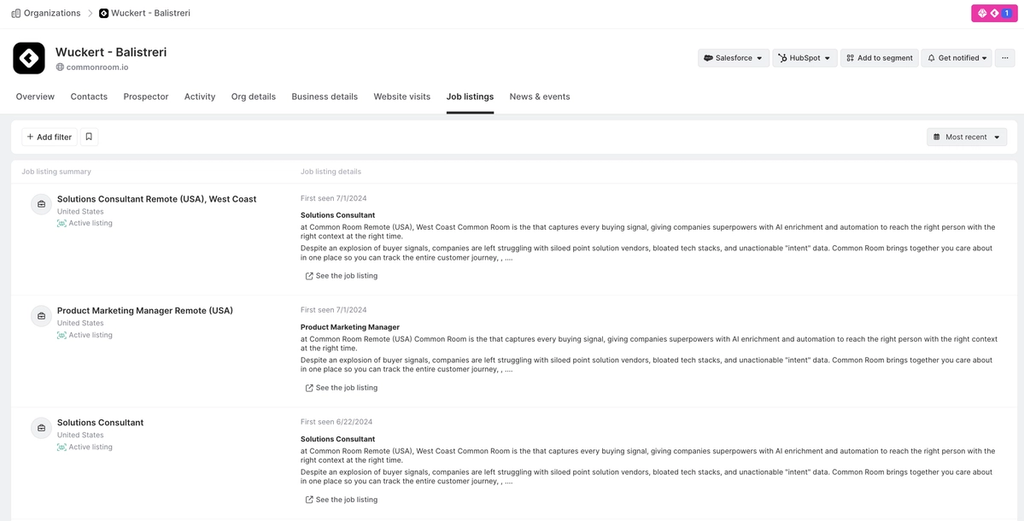 Job listings are an out of the box signal that all organizations in Common Room have. To best use job listings, you can target organizations using job listings filters to help you find job openings corresponding to certain functional roles, locations, or keyword searches to identify specific signal from a job listing.