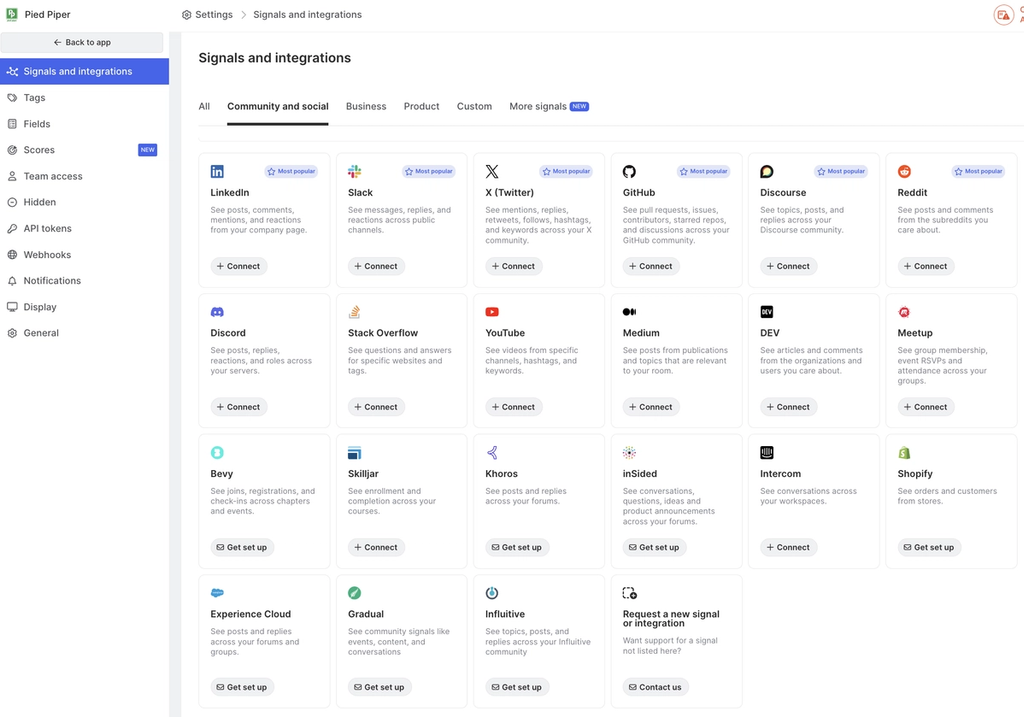 Common Room provides a suite of integrations to help you ingest community and social signals, which are key to illuminating the Dark Funnel. Integrations capture contacts, organizations, and all of their corresponding activity-based signals.