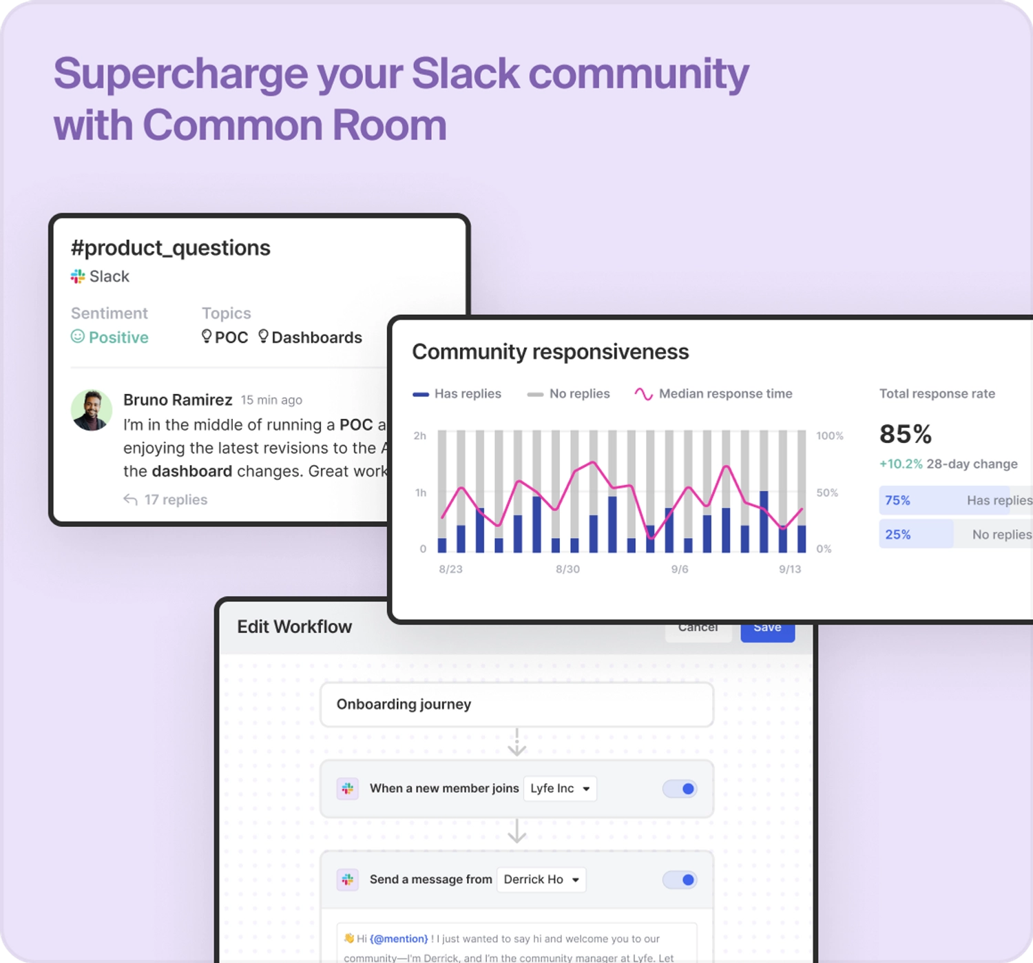 Workflows enable you to engage and manage your Slack workspace automatically using the power of Common Room. These workflows can message your community Contacts from your own personal Slack account — empowering you to open direct conversations with Contacts at scale.