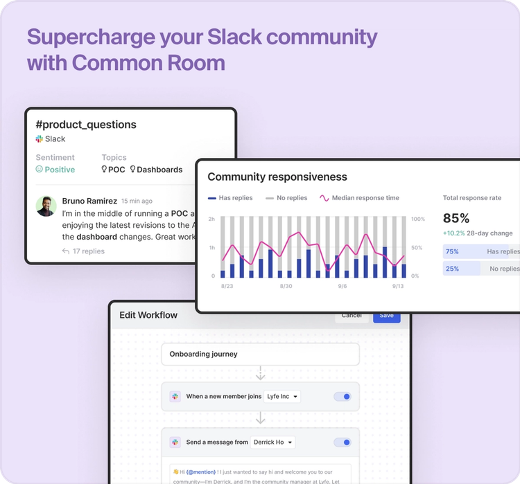 Workflows enable you to engage and manage your Slack workspace automatically using the power of Common Room. These workflows can message your community Contacts from your own personal Slack account — empowering you to open direct conversations with Contacts at scale.