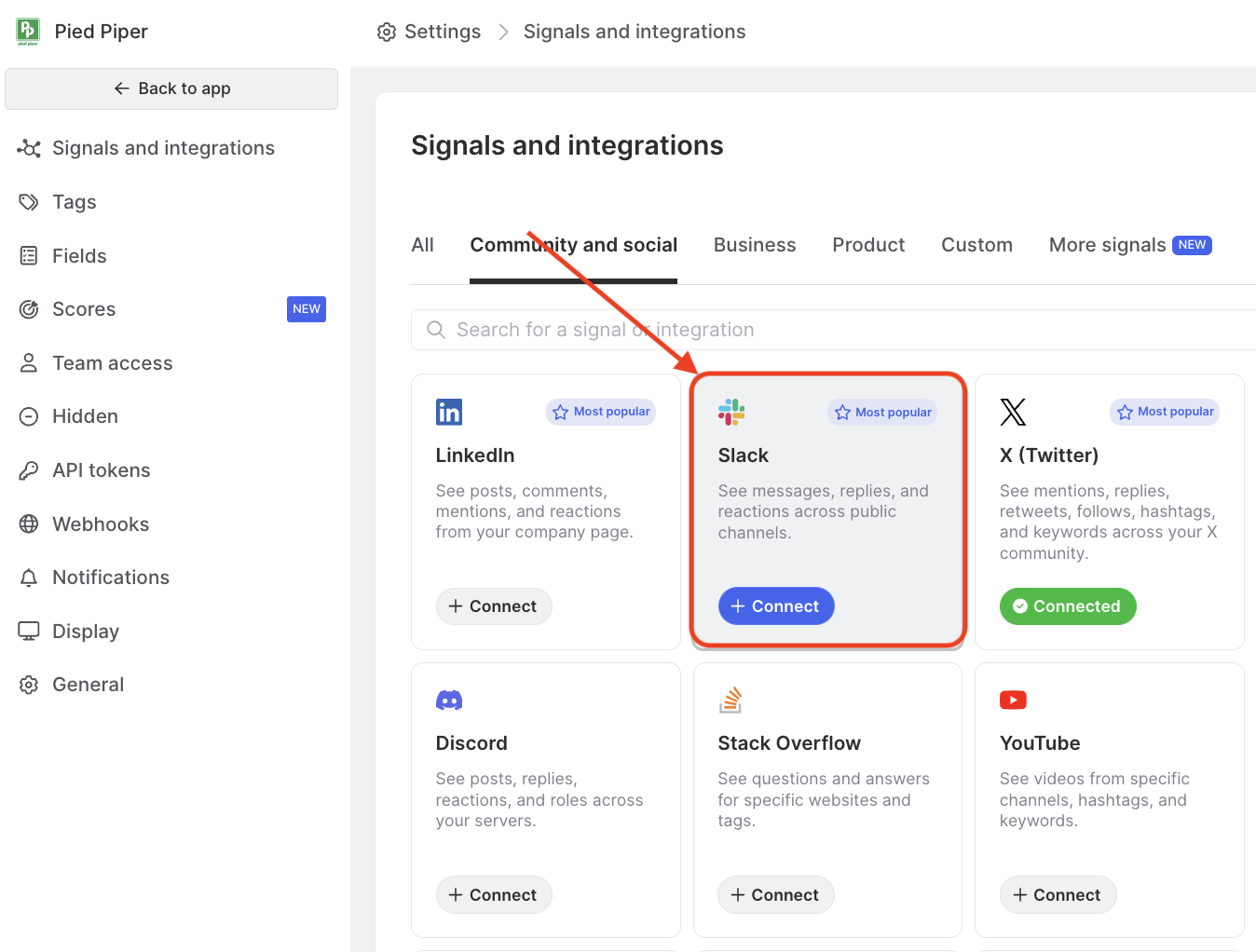 - Connect Slack: You'll need to be an admin in the Slack workspace if you want to connect to Common Room. Additionally, you'll either need a paid Slack plan or have fewer than 10 installed applications in your Slack workspace.