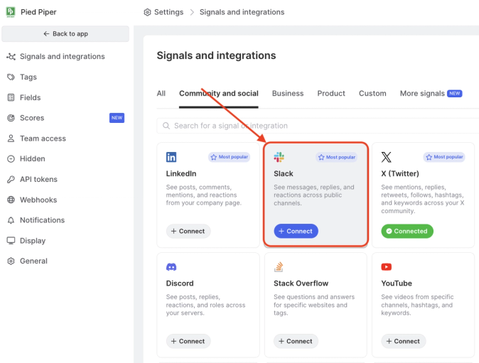 - Connect Slack: You'll need to be an admin in the Slack workspace if you want to connect to Common Room. Additionally, you'll either need a paid Slack plan or have fewer than 10 installed applications in your Slack workspace.