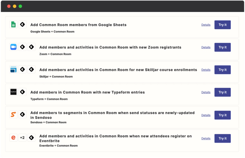 Here are some more examples that show just a few of the many ways you can integrate Common Room with other applications through Zapier.