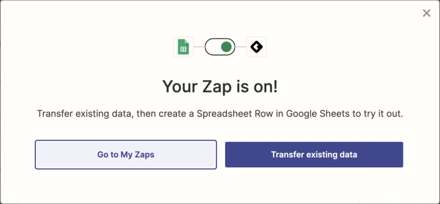 Once Zapier returns a success response from the test, you should now be able to go to Common Room and see the new Activity and Contact. After you click publish, you will be prompted to run your Zap on the existing contents of your file with "Transfer existing data". This is a great way to transfer data you’ve already collected.