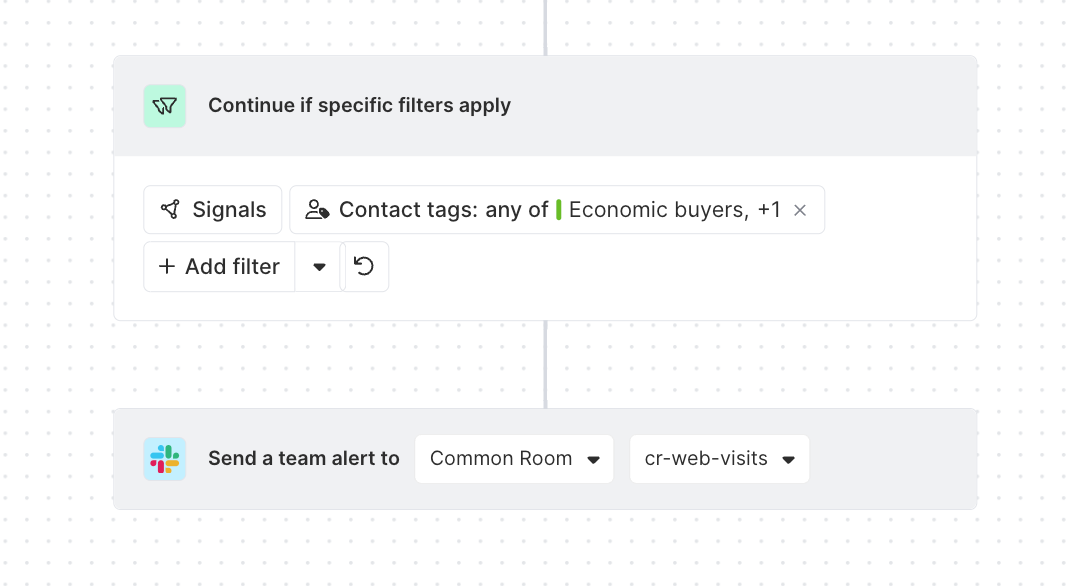 Keep your team updated of all important website visits using Common Room’s team alert feature in tandem with website visits. Website visits will be sent a Slack channel of your choosing for real-time or batched alerts.