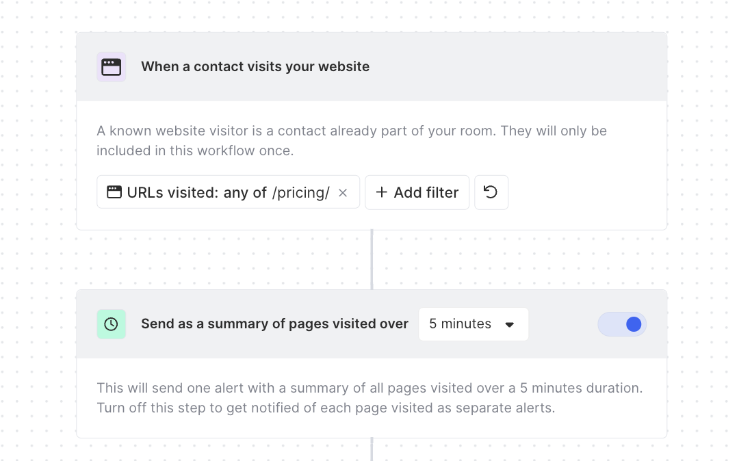 - Once you have made this selection you can input further criteria for whether a website visit should trigger an alert (e.g. you only want alerts when someone visits your pricing page).