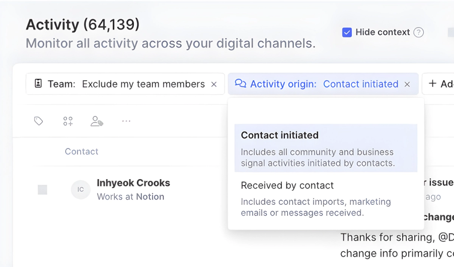 Filters are a property of any Contact, Activity, or Organization within Common Room by which data can be organized. A new filter — Activity Origin — allows you to filter ContactS, Segments, Activities, and Organizations by Contact Initiated or Received by Contact.