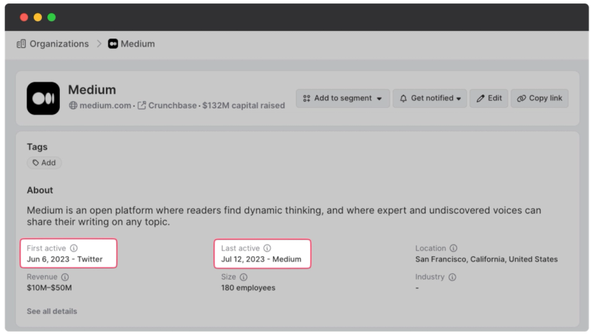 In Contact and organization profiles, the Common Room widget will show First Active, Last Active, and any associated signals based on Contact initiated activities. | |