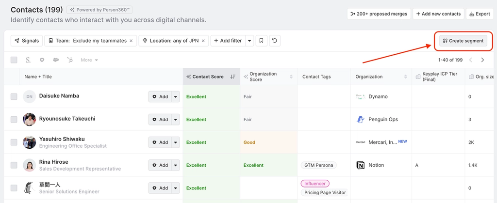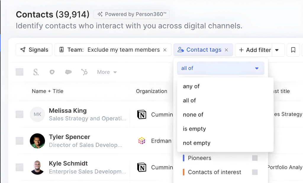 In addition to filtering by Contact attributes, you can add-on Activity, Organization, and signal-specific filters.
