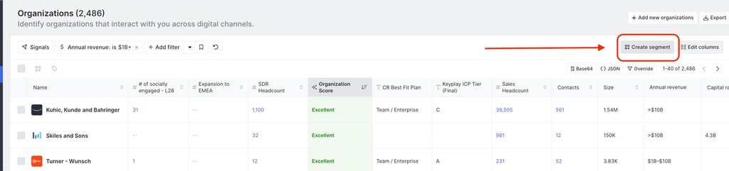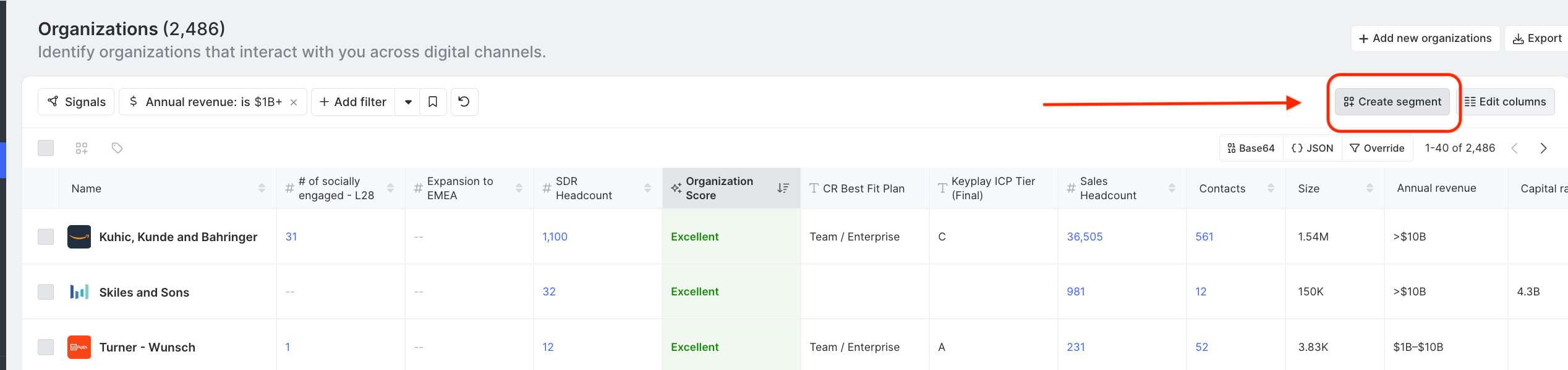 Once you have selected the perfect set of filters in the Org explorer, you can add the organizations from this list to a new segment with a single click. After all relevant filters have been selected, click the "Create segment" button on the right side of the filter section and your new organization segment will be pinned to your home screen.