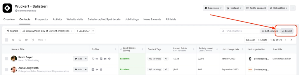 - Contacts: list of all Contacts who are associated with the organization (based on their primary domain URL). The Contact list can be exported from the Contacts tab by selecting the "Export" option in the top right of the tab.