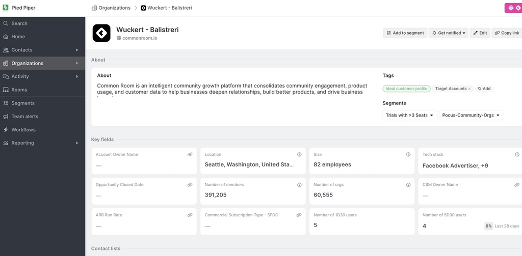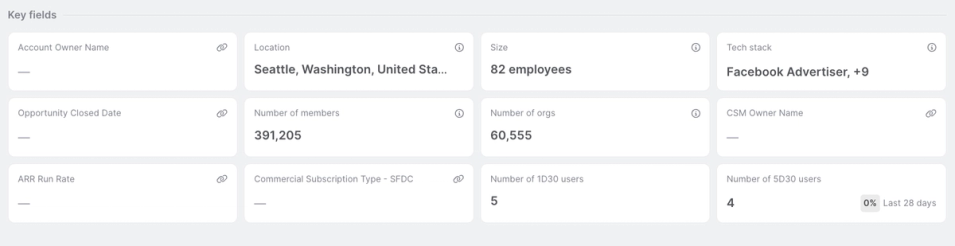 Each organization has an organization profile page. You can customize what information is surfaced at the top of every organization profile page in your Common Room with key fields, such as revenue, opportunity stage, account owner, or location.