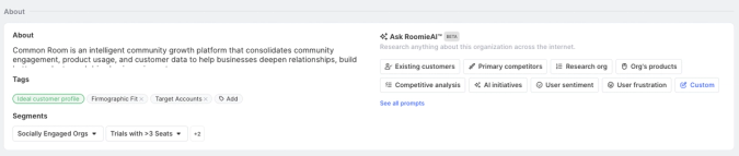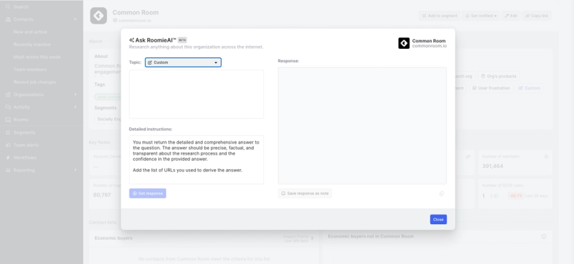 Additionally, you can perform AI-assisted research about an Organization using RoomieAI. RoomieAI allows you to use out-of-the-box account research questions that combine internet searches with AI analysis to get an answer. If you want to ask something more nuanced, you can always input a custom question. Be sure to input your question in the first section of the RoomieAI popup and provide further detailed instructions in the ‘Detailed instructions’ section if desired.