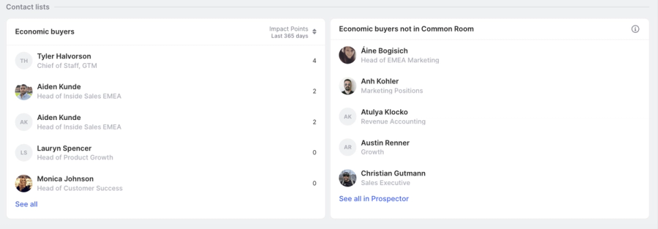 - Economic buyers: Displays Contacts who meet the criteria for an economic buyer, along with their impact points from the past year.