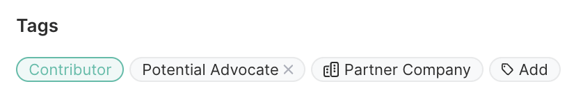 In addition to appearing on the organization profile, organization tags also appear on the profiles of Contacts based on the organization they work at. When viewing a Contact's profile or activity, organization tags associated with the organization that the Contact works at will be identified by an icon depicting two buildings. Organization tags cannot be applied or removed from these pages.
