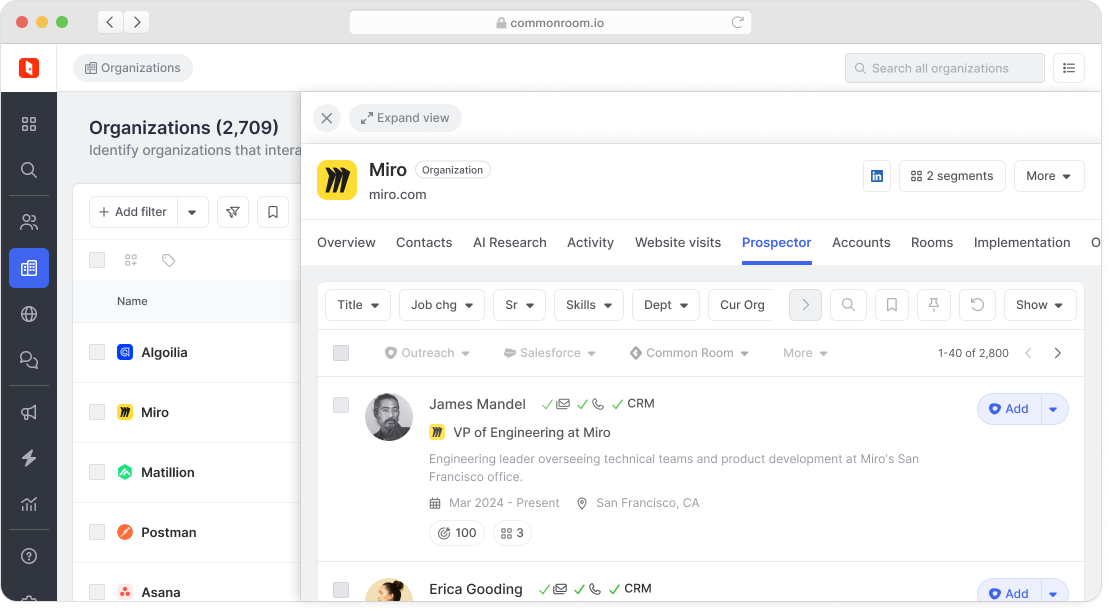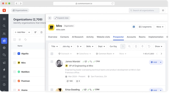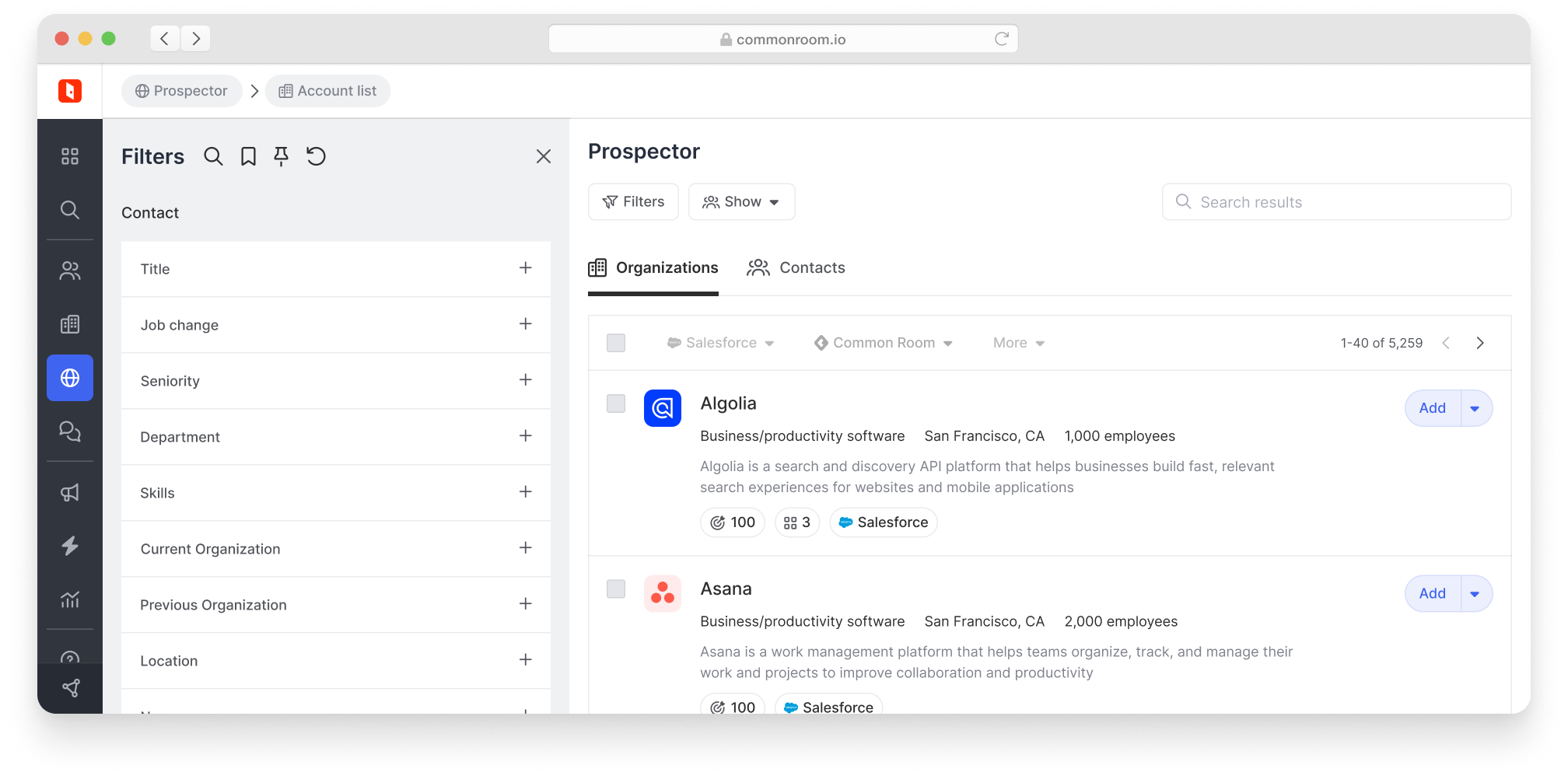 With Prospector, you can easily find new contact and organization profiles that can be added to your room using Common Room's constantly refreshed database of 300M-plus B2B profiles.