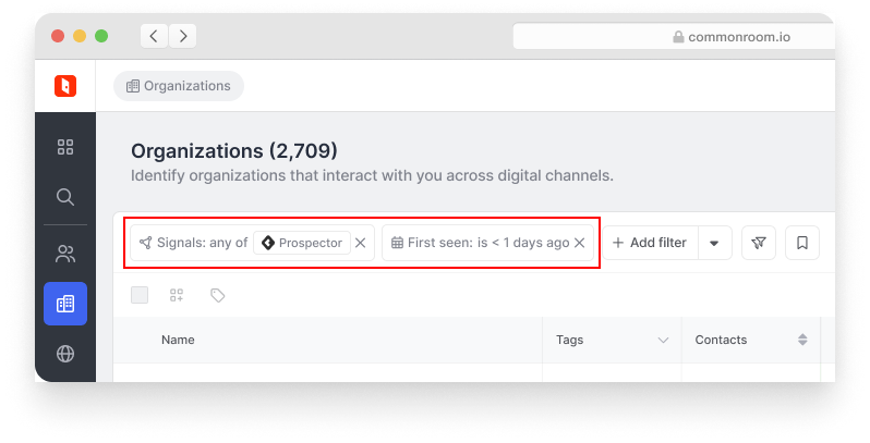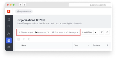 - Once Contacts are added to your room, we will create a new signal, Prospector, and add all Contacts under that signal. Signals can be used as quick filtering criteria when navigating through Contacts and Orgs.
