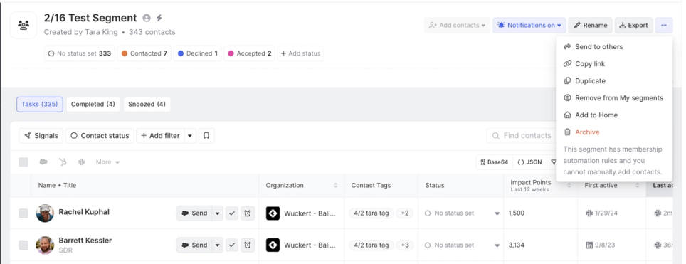 You can share a Segment with team Contacts who are collaborating with you on the Contacts and Organizations in the Segment. To share your Segment: