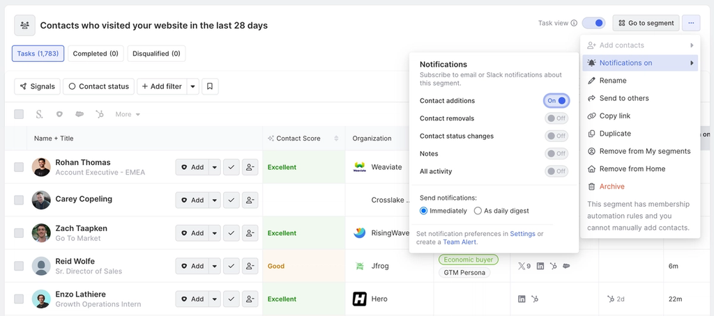 To stay on top of key changes being applied to a Segment, you can subscribe to email or Slack notifications. Start by clicking the notifications button at the top-right of your Segment. You can then choose to subscribe to immediate or daily digests about: