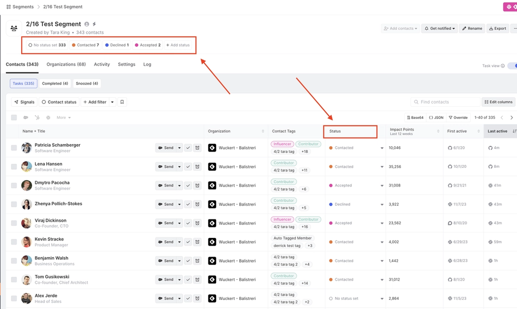 This section covers how to track and organize Contact cohorts and programs by applying, editing, and creating statuses in a Segment.