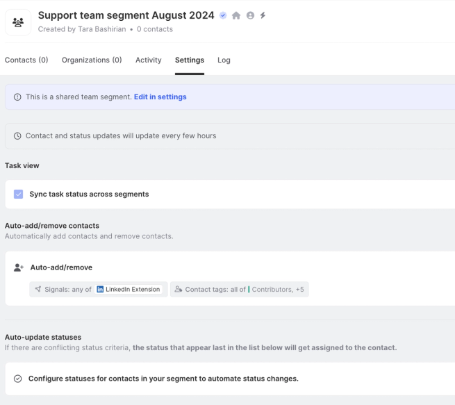 - To go from creating and editing your team segment to seeing it in action in the platform, select the "More actions" icon to the right of your team segment in the "Segments" section of Common Room settings. From there, choose "View in app" from the drop down. You will then be directed to the segment's profile.