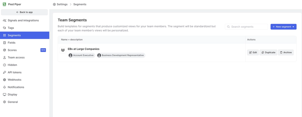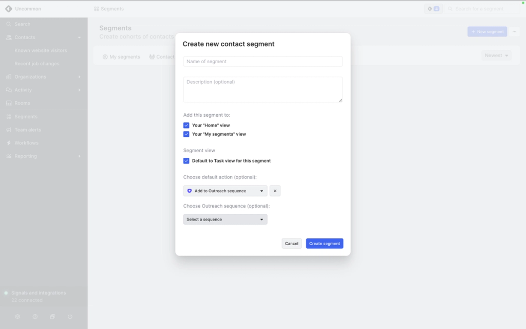 - To create a team segment, navigate to the Common Room Settings page and then navigate to the Segments tab. Select + New segment and choose the type of segment you would like to create: Contact, Organization, or Account.