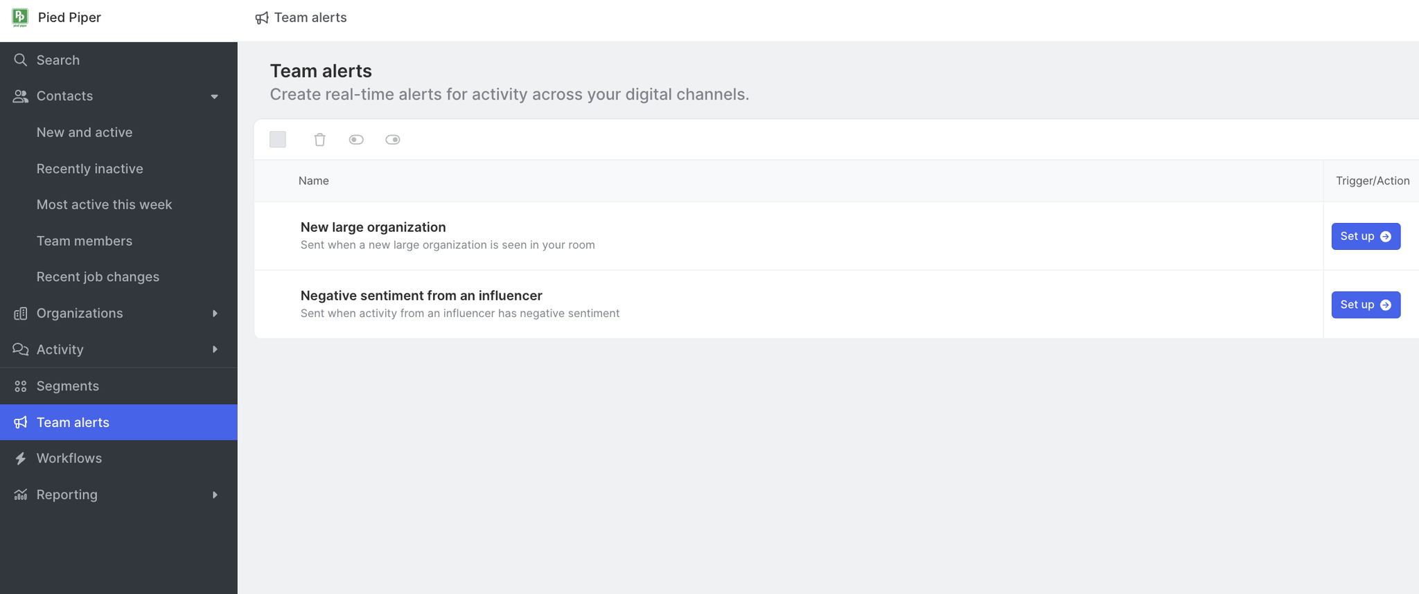 Team alerts allow you to trigger a message to an internal Slack channel when Activity occurs that you and your teams want to know about. Unlike notifications with a simple on/off toggle for a given Contact, Organization, or Segment, alerts can be customized to ensure your team receives only the most relevant updates.