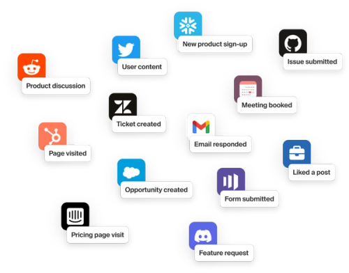 Seamlessly aggregate, merge, and enrich signals from 50+ channels, spanning social, community, product, code collaboration, CRM, and more.