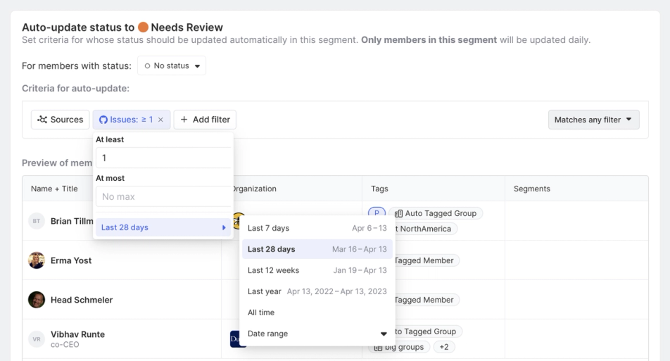 For our main channel, GitHub, this is pretty straightforward. We can head over to the Members view and narrow our view by adding a filter that shows members with a GitHub issue in the last 28 days.