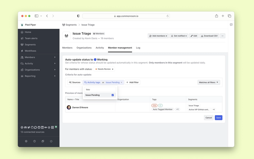 To do that, we can click on the Member management tab of our segment and select Set criteria to auto-update the “Working” status.
