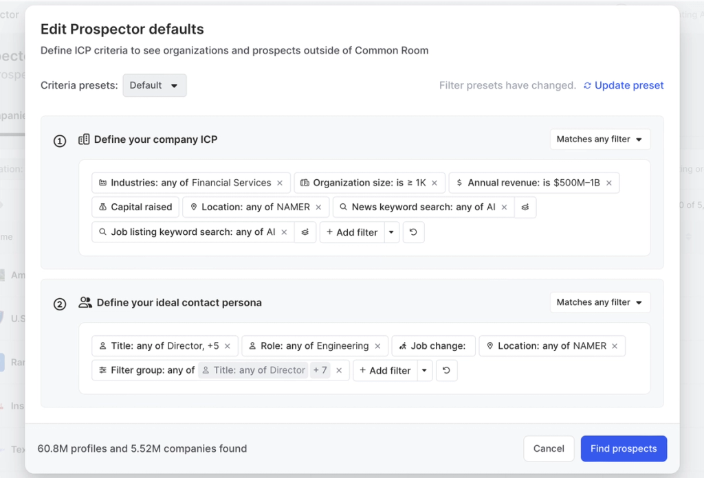 FiltersCommon Room’s filters feature allows you to highlight individuals and organizations based on any combination of factors. This makes it easy to surface specific people and companies based on firmographic details, cross-channel activities, product usage, and more.