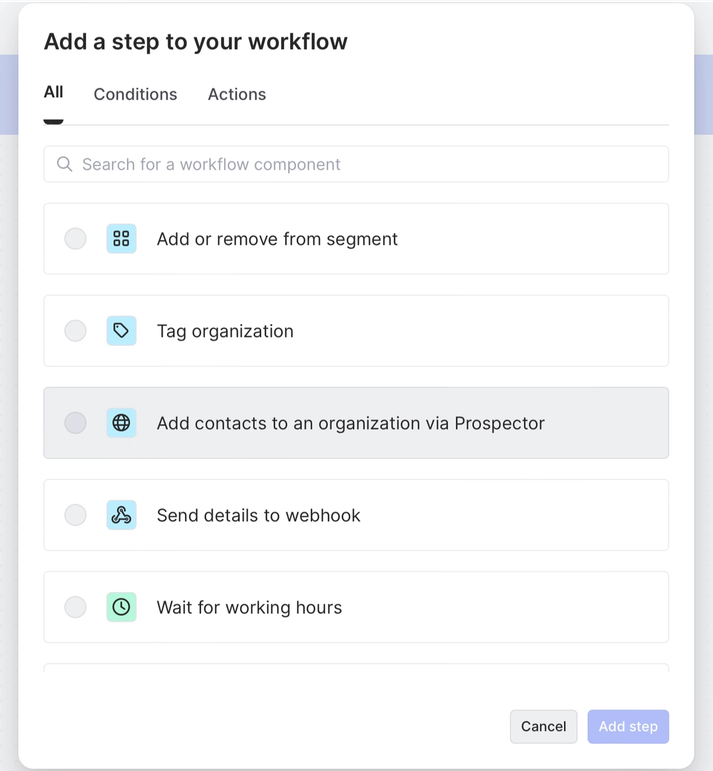 We’d simply go to Workflows in the left sidebar, create a new workflow to run for organizations that match our criteria, and choose Add contacts to an organization via Prospector.