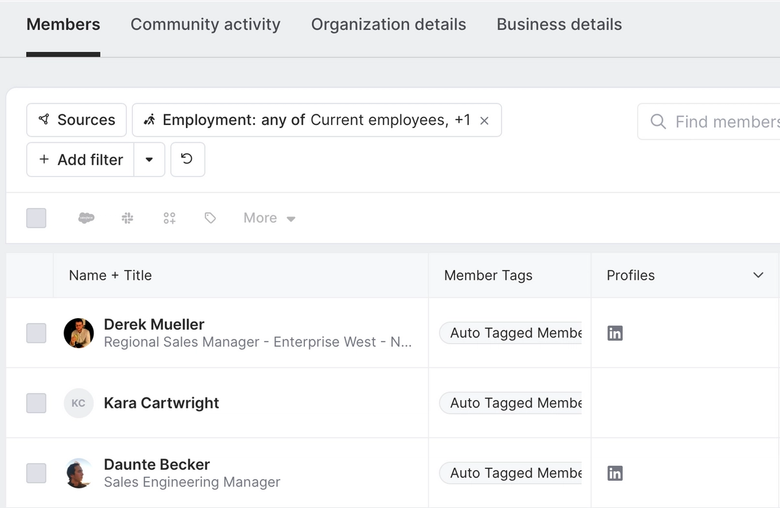 We can drill down into organizations within our segment to see all the individuals associated with a particular account. Simply click on an organization’s name and scroll down to the contacts section.