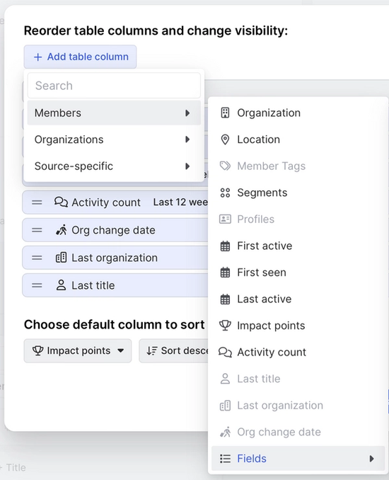 Click Edit columns, choose Add table column, select Contacts, and hit Fields.