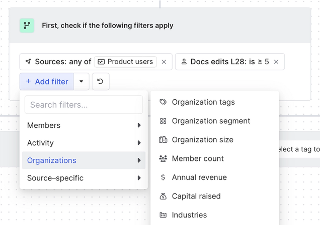 We want to focus on accounts where multiple people are using our product, so we’ll select Fields again and add a filter for organizations where there are three or more document editors.