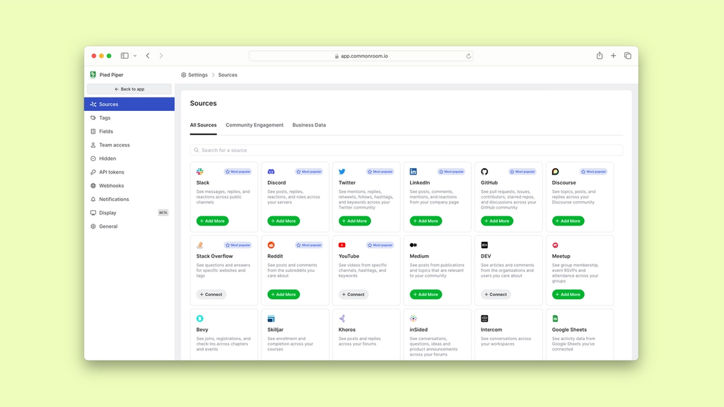 Log in to Common Room, click on Settings in the left sidebar (the little ⚙️ icon at the bottom), and go to Sources.